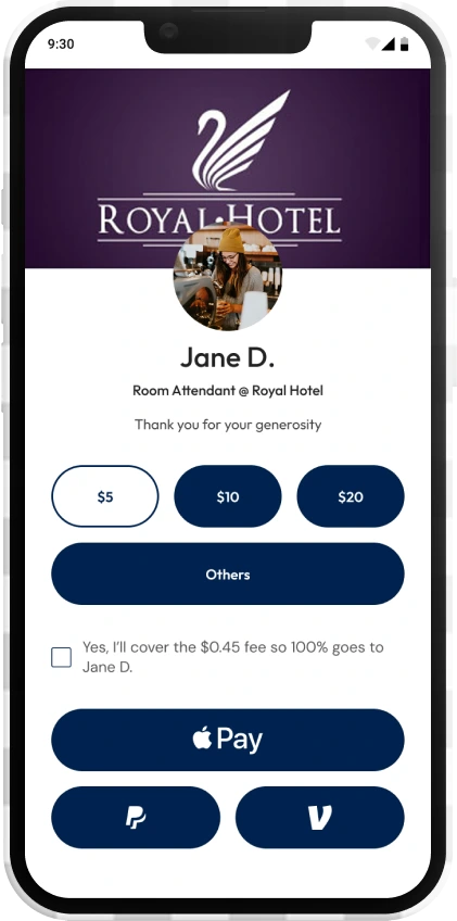 No exchanging personal details that other apps like Venmo, Cash App, or Zelle require. Guests can tip anonymously from anywhere at anytime and receive a receipt.